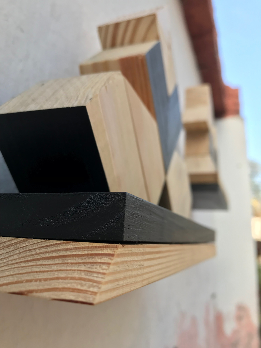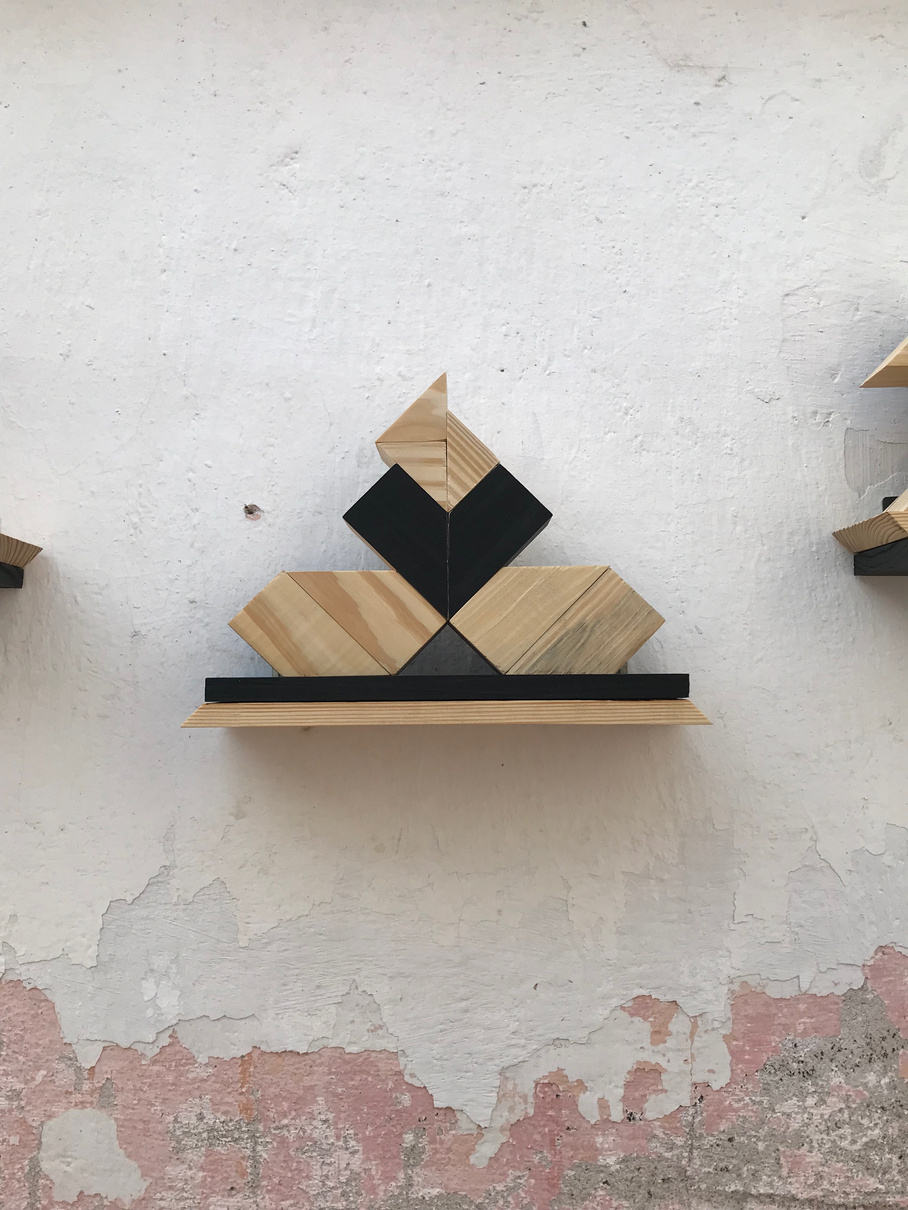 Sculptural objects made from Palestrina wood cuttings. Brushed, painted and lacquered, of variable sizes and formats with magnet attachment.